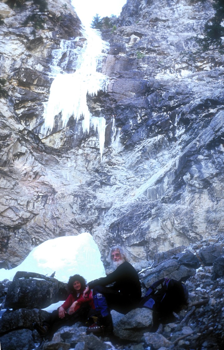 Tommy and Joe take a rest at the base of Sand Dune Falls; unfortunately, the bottom portion of the route was missing -- she no go