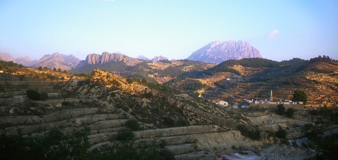 View of the climbing areas of Sella from the village of Sella (the graveyard is on the hill on the right)