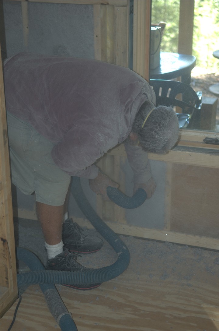 A nasty job, Schelly blows insulation into the bathroom wall