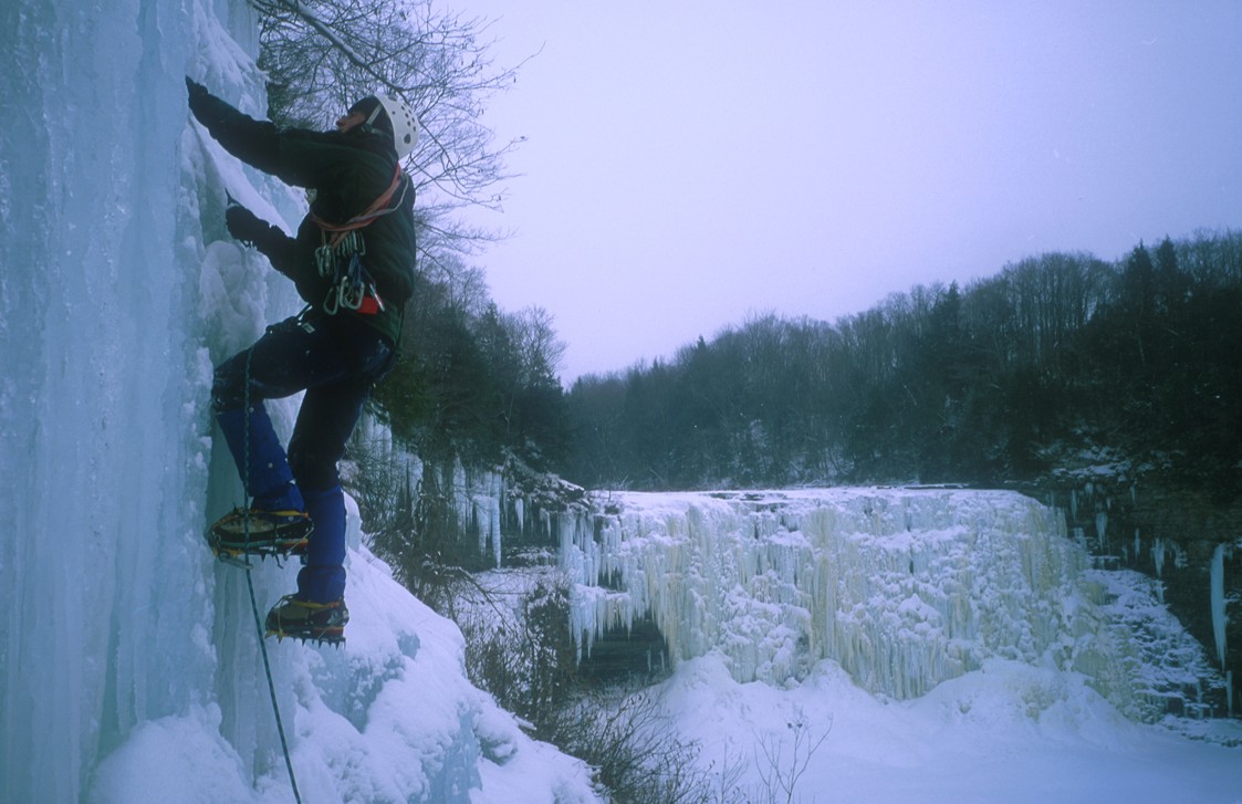 Simon leads a column that forms near the Gorge Trail; main falls in the background