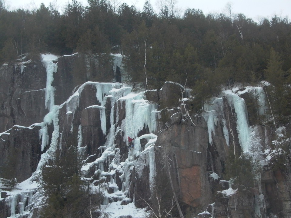 The Big Brother wall in fat conditions; Big Brother is on the broken ice column on the left, Tommy is on Rhiannon, and Lilith is on the far right. On the orange wall just right of Tommy is the free-hanging column called Not Likely