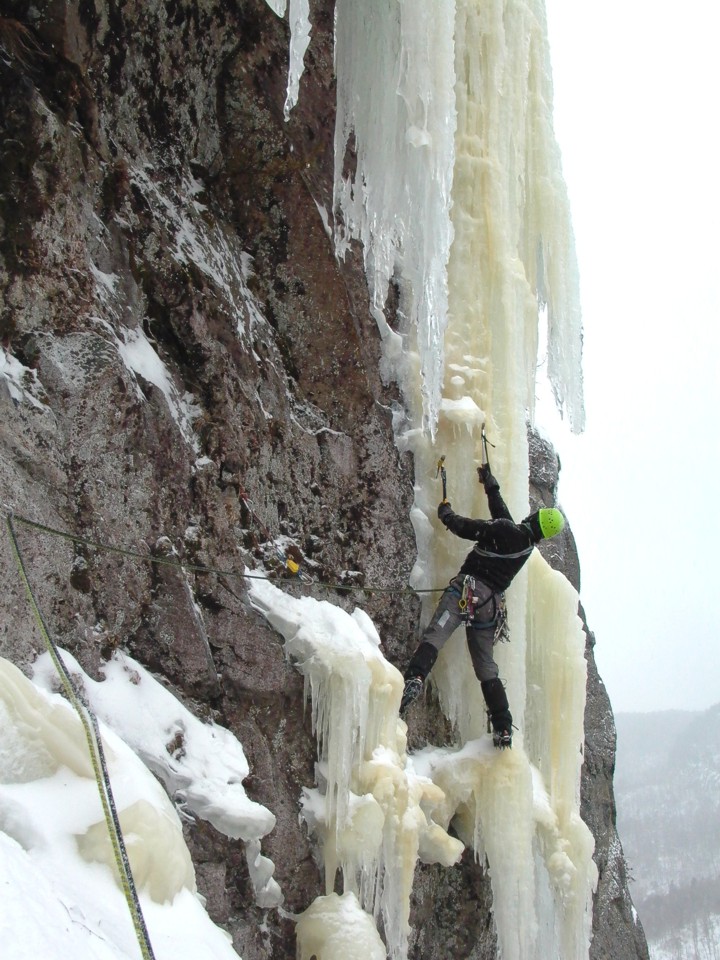 Joe gets established after the traverse and prepares to climb the overhanging ice above