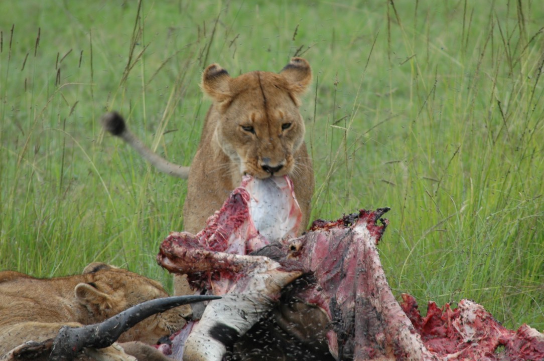 Lions feasting in a cloud of flies